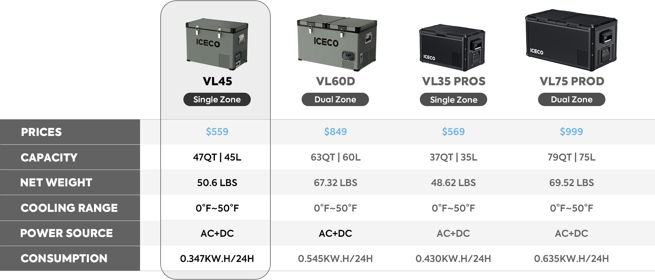 47.5QT VL45 Portable Fridge Single Zone Freezer